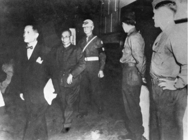 這是當(dāng)年在南京制造大屠殺的主犯華中派遣軍司令松井石根(左二)被處決。新華社發(fā)
