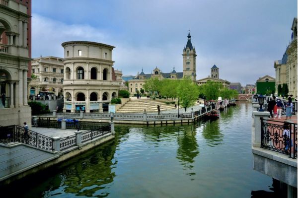 威尼斯水城的建筑大多都是根據(jù)威尼斯城為藍(lán)本設(shè)計(jì)建造的,貫穿200多座歐式城堡。貢多拉船和船夫除了不是金發(fā)碧眼,船的造型和船夫服飾都很有“威尼斯”味兒。