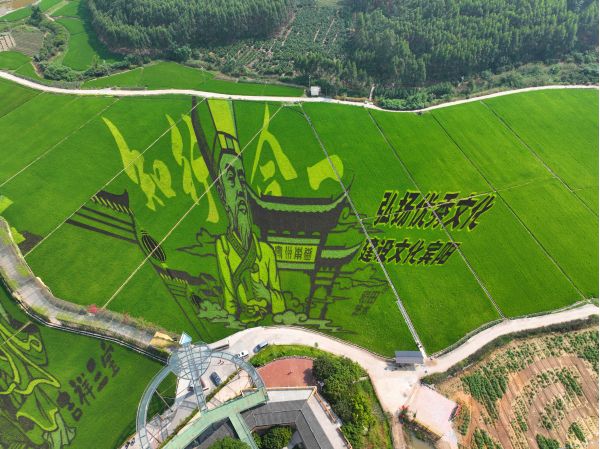 近期,大陸村稻田藝術(shù)景區(qū)迎來了一批又一批游客。站在觀景臺(tái)上俯瞰,右邊稻田藝術(shù)畫的主題是“文化賓陽(yáng)”,一幅巨大的明朝思想家王陽(yáng)明像映入眼簾,身后則是“賓州南街”以及“知行合一”四個(gè)大字, 展現(xiàn)了賓陽(yáng)五大文化中的陽(yáng)明文化與古城文化。左邊有兩幅稻田藝術(shù)畫,一幅是“如虎添翼”,一只憨萌可愛的小老虎背著一雙翅膀,寓意大陸村村民祝愿游客“凡事都能如虎添翼”;另一幅是“吉祥三寶”,畫面上是烤著串的牛魔王、拿著手機(jī)自拍的鐵扇公主和忙著給爐子添火的紅孩兒,趣味橫生,這是對(duì)“西游”文化的一種趣味解構(gòu)。
