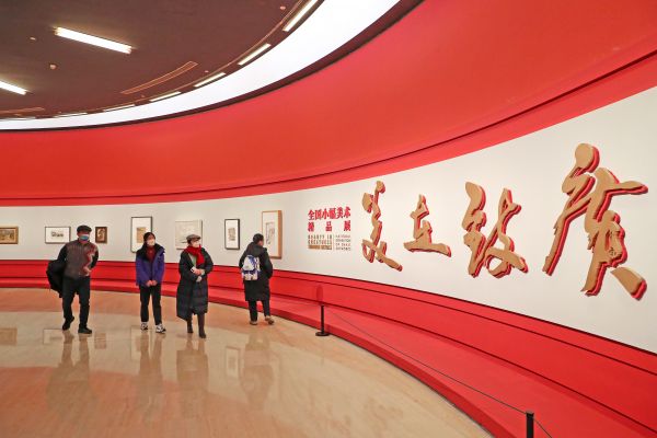 本次展覽的作品中,尺幅最小的僅有郵票大小,最大的也僅半米見方。這其中既有美術(shù)史中的經(jīng)典名作,如齊白石的《咸蛋小蟲》、徐悲鴻的《雙獅》、李樺的《怒吼吧,中國(guó)!》、胡一川的《牛犋變工隊(duì)》等,也有00后藝術(shù)家的最新創(chuàng)作。此次展覽展出了從6500余件投稿中精選出的近600件征集作品,另有中國(guó)美術(shù)館館藏、特邀作品400件,共計(jì)1000件,涵蓋中國(guó)畫、油畫、版畫、雕塑、水彩、工藝等美術(shù)種類,是近年來中國(guó)美術(shù)館單次展出作品數(shù)量最多的一場(chǎng)。