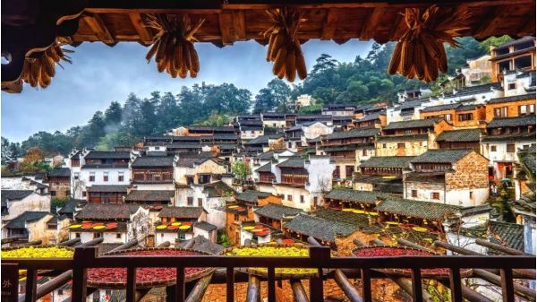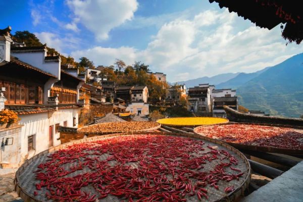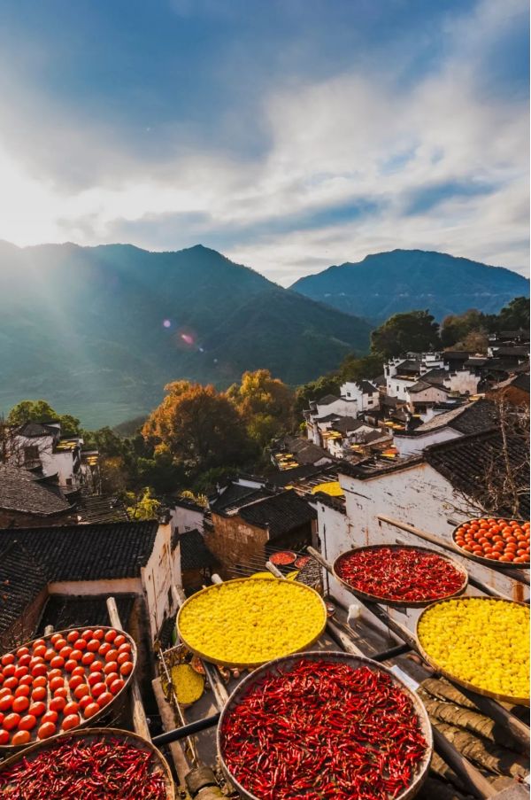 每到豐收時節(jié),陽光下數(shù)百棟錯落的徽派民居,和曬架上五彩繽紛的豐收成果構成絢爛的“曬秋”景觀。