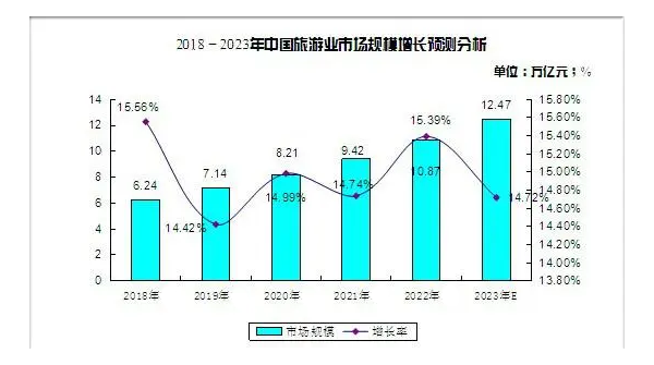 2023年中國旅游市場高速增長,入出境市場平穩(wěn)發(fā)展,供給側(cè)結(jié)構(gòu)性改革成效明顯。從2012-2017年旅游行業(yè)數(shù)據(jù)來看,全國旅游收入保持著兩位數(shù)穩(wěn)定增長。2014年全國旅游收入達3.73萬億元,同比增長25.4%,達到近幾年來增速峰值,2015年增幅相對有所放緩。隨著近年來,政府大力發(fā)展全域旅游、冰雪旅游等,2015-2017年中國旅游業(yè)收入增速不斷提高。2018年全國旅游收入將達6.24萬億元,增速約增至15.6%,2023-2028年中國旅游行業(yè)市場深度研究及發(fā)展前景投資可行性分析報告預(yù)計到2023年全國旅游收入將達到12.47萬億元 ?