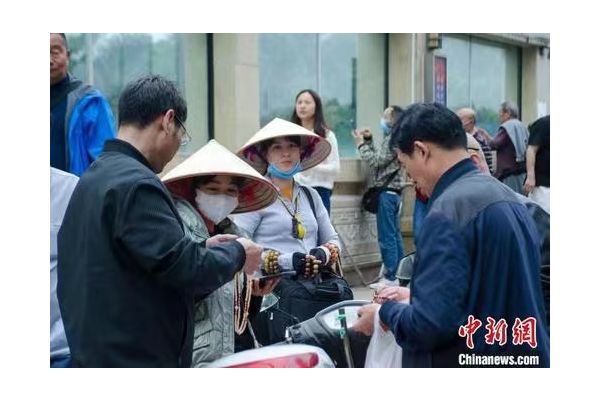 “我剛從越南過來,請幫忙開個張。”范氏香用一口流利的中文力爭早市“開門紅”,并向記者展示她的邊境通行證,她的單肩挎包里裝有紅木、黑檀、沉香等不同材質(zhì)的手串,手上也戴著數(shù)串向游客展示。范氏香說,她恢復(fù)這項營生已經(jīng)十來天,前一天賺了100多元(人民幣,下同)利潤。