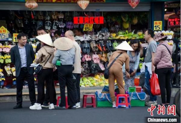 單肩挎包幾乎是范氏香和同行們的標(biāo)配,女子戴著一頂圓錐形的帽子,男人們則戴一頂圓頂帽子,他們穿梭在人群中售賣越南小商品,構(gòu)成中越邊境上的一道獨特風(fēng)景線。