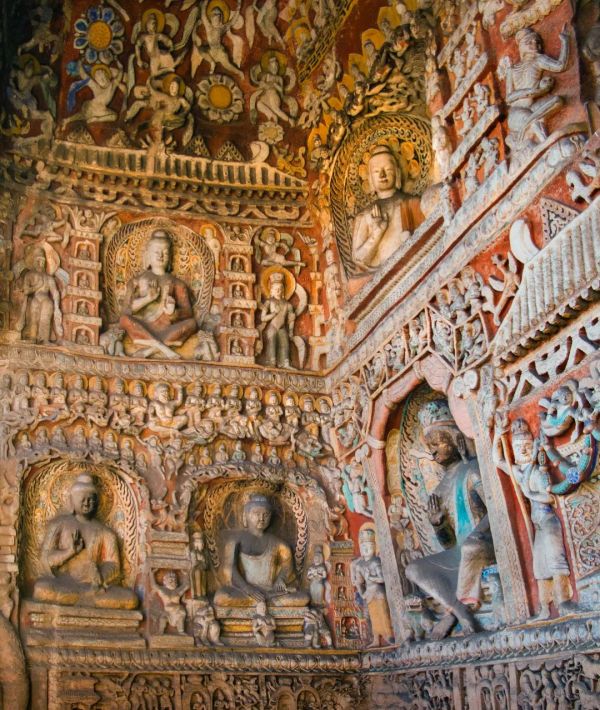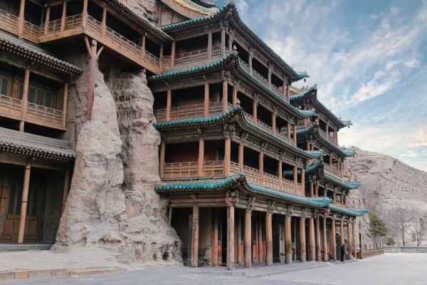 云岡石窟依山而鑿,浮雕飛天,生動活潑。