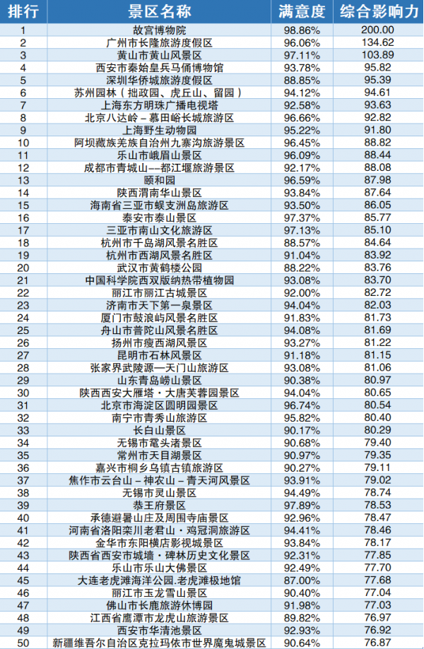 318家5A級景區(qū)中游客們滿意度最高的TOP50是哪些?基于對我國5A景區(qū)的全網(wǎng)口碑輿情分析,各個景區(qū)創(chuàng)建以來截至目前,旅游口碑表現(xiàn)最好的前50家景區(qū)如下表所示:其中,故宮博物院、廣州長隆旅游度假區(qū)、黃山風(fēng)景區(qū)、秦始皇兵馬俑博物館、深圳華僑城旅游度假區(qū)位列前五。