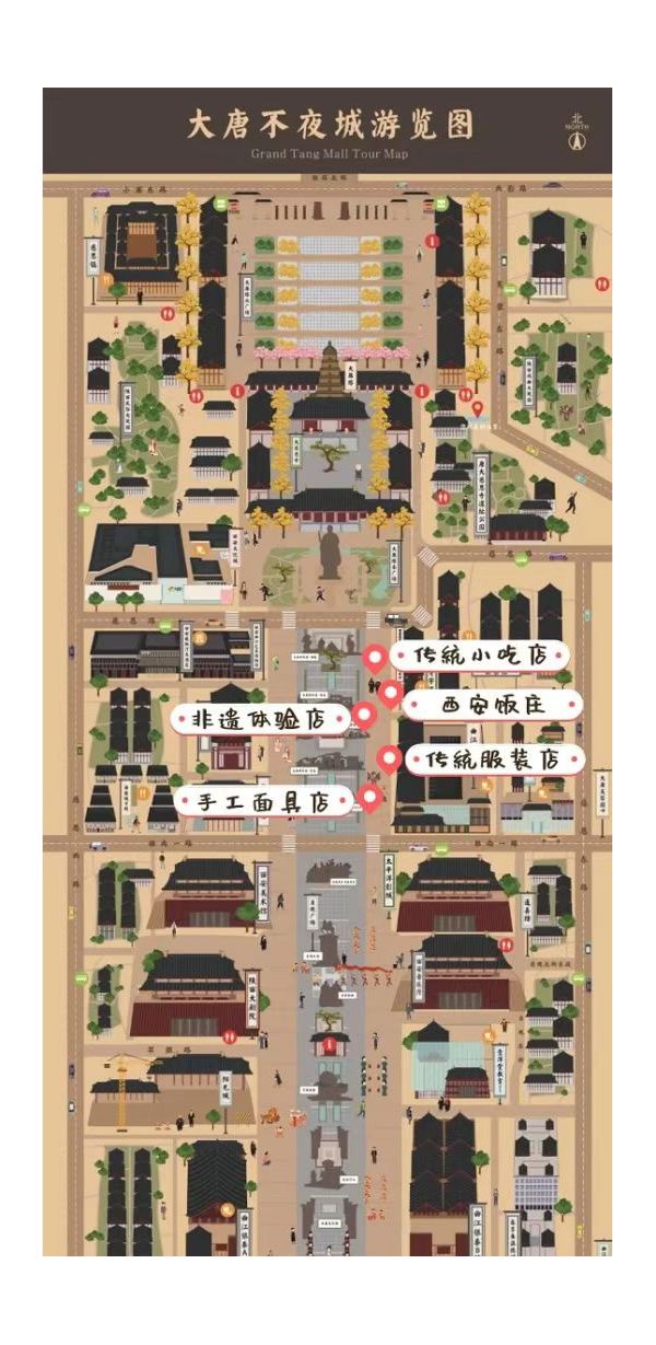 按照建設(shè)有中國特色、地方特點(diǎn)、國際水平步行街的總體要求,以國際化、人文化、特色化為目標(biāo),規(guī)劃形成了大唐不夜城步行街“一軸·兩市·三核·四區(qū)·五內(nèi)街”的總體布局。一軸:是指"大唐不夜城文化商業(yè)軸";兩市:是指"貞觀新風(fēng)韻唐市、創(chuàng)領(lǐng)新時(shí)代都市";三核:是指"大雁塔廣場景觀文化核心、貞觀文化廣場時(shí)尚藝術(shù)核心、創(chuàng)領(lǐng)新時(shí)代廣場休閑時(shí)尚核心";四區(qū):是指"大雁塔盛唐景觀人文風(fēng)貌展示區(qū)、中華傳統(tǒng)美食文化生活品鑒區(qū)、貞觀國際藝術(shù)文化交流體驗(yàn)區(qū)、創(chuàng)領(lǐng)新時(shí)代都市休閑文化區(qū)"。五內(nèi)街:是指"慈恩鎮(zhèn)-陜西風(fēng)情小吃文化街、新樂匯-中華傳統(tǒng)美食文化街、歐凱羅-潮流音樂酒吧文化街、溫德姆-品味生活咖啡文化街、陽光城-SKP時(shí)尚青年藝術(shù)文化街"。