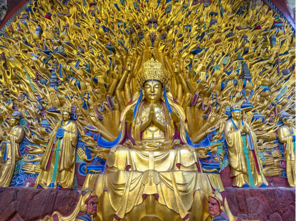 牧牛道場(chǎng)的石刻非常生活化,看似在講牧牛人和牛之間的互動(dòng)變化,實(shí)則是用生活化的方式傳達(dá)出佛教禪觀的修正過程;圓覺洞是修煉成佛的最后一步,體現(xiàn)的是佛祖問心的過程,這個(gè)洞深12米,有三絕:采光、排水以及鑿石,進(jìn)去的時(shí)候一片黑暗,后來慢慢變亮,就是這個(gè)洞采光的特點(diǎn),也給人一種心靈得到洗滌逐漸變得通透的感覺;最令人震撼的石刻就是千手觀音像了,經(jīng)過多年的修復(fù),千手觀音終于在世人面前呈現(xiàn)出她最完美和輝宏的姿態(tài),身披金縷,面容莊嚴(yán),據(jù)修復(fù)數(shù)據(jù)顯示此處千手觀音像共有1008只手,每只手的姿態(tài)和手中的法器無一重復(fù),是名副其實(shí)的千手觀音,在每只手的掌中都有一只眼睛,也是一處通風(fēng)口,既有藝術(shù)性又能保證石刻不被風(fēng)化,千年而不倒。