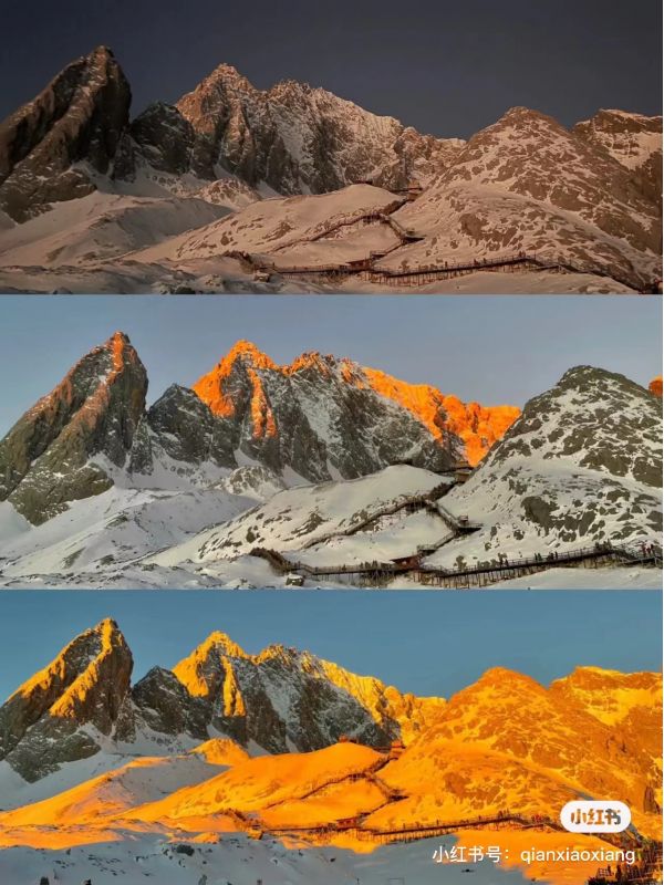 2.當(dāng)2023年的日光再次照射玉龍雪山,當(dāng)你在4680米的高度,與云海一起見證日照金山的奇跡;當(dāng)中國無限壯闊的天地,讓你在人海里熱淚盈眶;當(dāng)每一次向上的腳步 在心中蕩起回響,彩云之南,數(shù)永遠(yuǎn)是詩和遠(yuǎn)方..來麗江,不去玉龍雪山,是一種遺憾…..玉龍雪山有終年不化的積雪,么皚皚白雪,脈脈山巒;這里的夜晚,云層開闊,星河璀璨;在雪山的懷抱中,迎著朝陽眺望,伴著星河入眠,這是玉龍雪山獨(dú)有的浪漫。