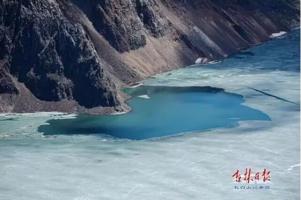 冬季水面結冰,白雪覆蓋。夏季,冰融化了,湖水變成了藍色。如今長白山天池水面破冰融化迎來“開冰期”。開冰時節(jié),湛藍的天池水與潔白的冰凌形成水波流轉、冰花碰撞的奇特美景。