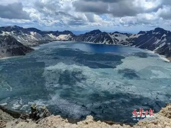 由于今年氣溫偏低,天池開冰又屬于“文開”,6月16日,冰封半年的長白山天池正式開冰,天池全面融化的時間在22日,經歷了7天的時間。湖面上的冰層隨著氣溫的升高,逐漸變薄、破碎、融化,猶如美麗的少女揭開神秘的面紗。作為一個獨特的天氣現(xiàn)象,深受攝影師和廣大游客的喜愛。
