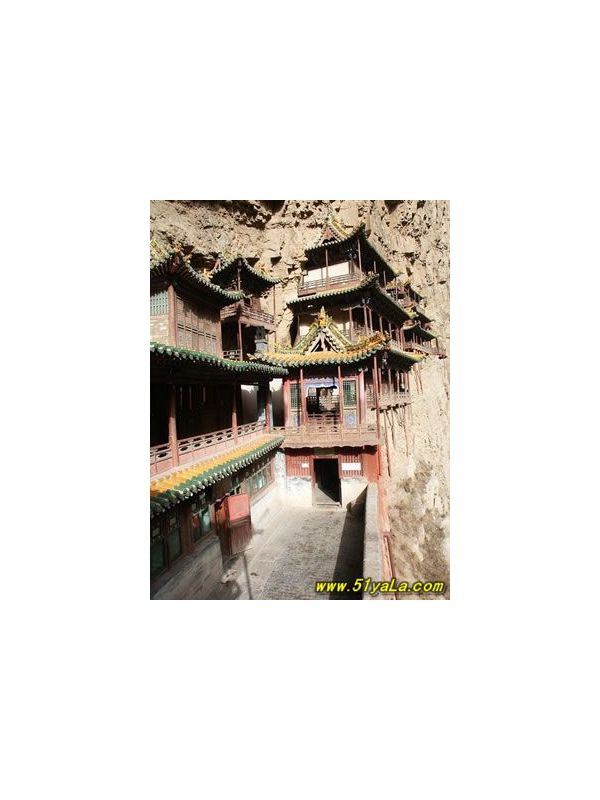 北岳恒山風景區(qū)內的另一處重要景觀是懸空寺。懸空寺位于北岳恒山腳下、渾源縣城南5公里處的金龍峽內西巖峭壁上。寺創(chuàng)建于北魏后期(約為公元471—523年),現(xiàn)存建筑分明清兩代修建后的遺物。懸空寺靠西面東,儼若精巧、別致、玲瓏剔透的玉雕懸于一幅巨大的屏風上。寺內共有殿宇樓閣40間。南北,有三檐歇山頂危樓聳起,對峙而立,由低向高三層疊起,離地百余尺,附于絕壁上,三面環(huán)廊國抱、六座殿閣,相互交叉,飛架棧道相連,高低錯落,木制樓梯溝通,遷回曲折,構思布局妙不可言、整個寺面似虛而實,似危而安,實中生巧,危里見俏,一種在國內其它寺廟中體會不到的奇險感緊緊地抓住游人的好奇心理。懸空寺內塑像頗多,有銅鑄、鐵鑄、泥塑、石雕像共78尊。三圣殿內的泥塑,具有唐、明兩代風韻,釋迎、韋馱、天女、阿難形體豐滿,神彩動人,仙女婀娜、韋馱英武、阿難虔誠,各具風彩。三教殿內,釋迦牟尼、老子、孔子三教臺流,共居一室,耐人尋味、始祖同堂,堪稱中國宗教史上的一段佳話。懸空寺內,有朝殿、會仙府、碧霞宮、純陽宮、樓臺亭、寢宮、梳妝樓、御碑亭等。