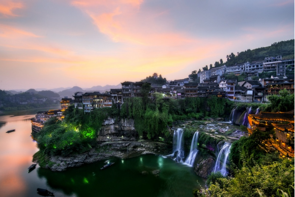 芙蓉鎮(zhèn)大瀑布是芙蓉鎮(zhèn)首屈一指的天然美景,任何到芙蓉鎮(zhèn)的人都必到瀑布。芙蓉鎮(zhèn)三面環(huán)水,瀑布穿鎮(zhèn)而過,別有洞天。這是湘西最大最壯觀的一道瀑布,高60米,寬40米,分兩級(jí)從懸崖上傾瀉而下,聲勢(shì)浩大,方圓十里都可聽見。春夏水漲,急流直下,飛虹相映,五彩紛呈,