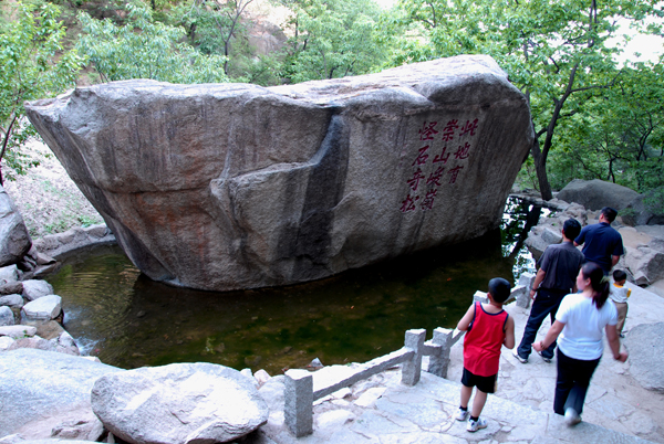 元寶石,上鐫“此地有崇山峻嶺,怪石奇松。古檀寧椿,“古檀”是密云。寧椿是名字。古密云縣的一位舉人經(jīng)過這里,被盤山的美景吸引住了,他想用一句話來概括盤山的勝景,于是他便借用了晉代著名書法家王羲之的《蘭亭序》中有“此地有崇山峻嶺,茂林修竹”一句,他看到盤山松樹長勢奇特,巖石形狀怪異。因而在這里留下了“此地有