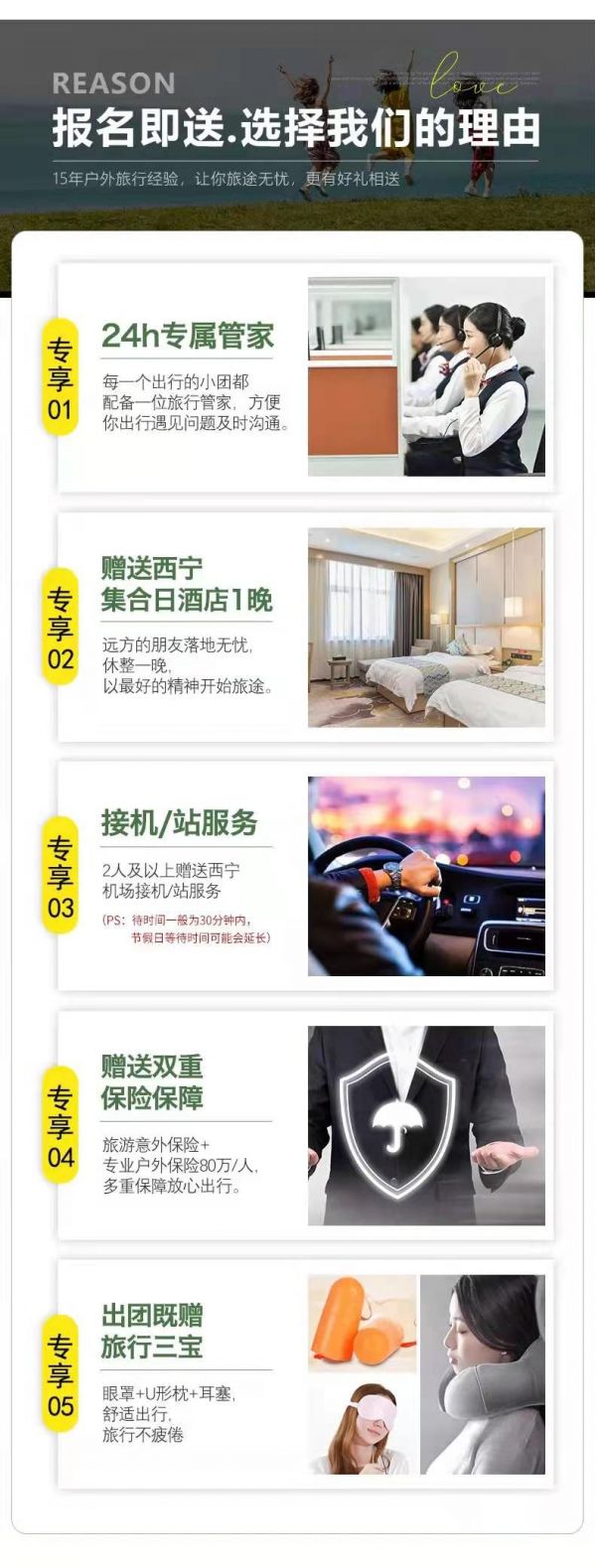 本次活動(dòng)提供西寧市內(nèi)24小時(shí)接機(jī)/接站服務(wù),工作人員會(huì)在您出發(fā)日期前一天21:30之前向您推送消息并與您聯(lián)系,如果超過時(shí)間沒有接到任何通知,請(qǐng)及時(shí)與報(bào)名處聯(lián)系。(接站等待時(shí)間一般為15-20分鐘,最長不超30分鐘,節(jié)假日拼單人數(shù)較多情況下客人等待時(shí)間可能會(huì)延長)。
