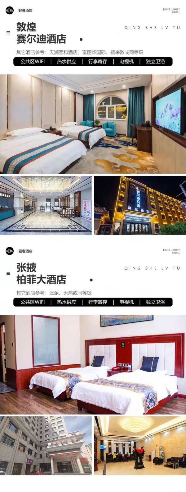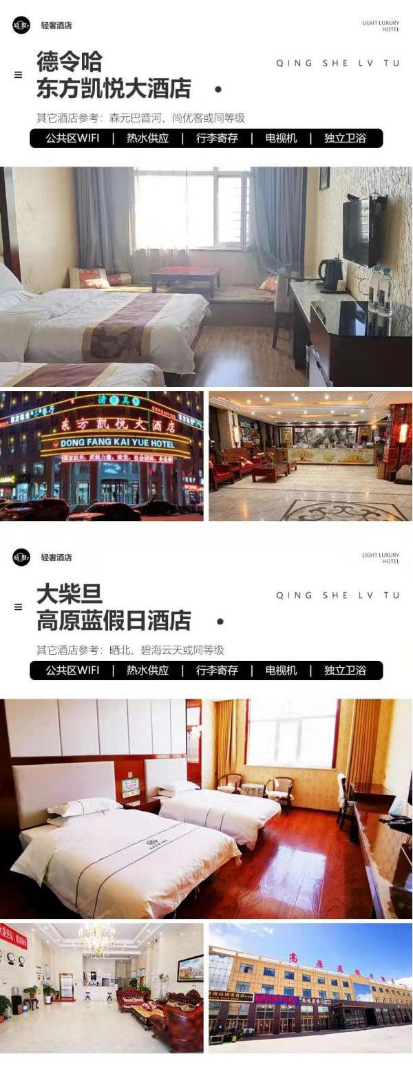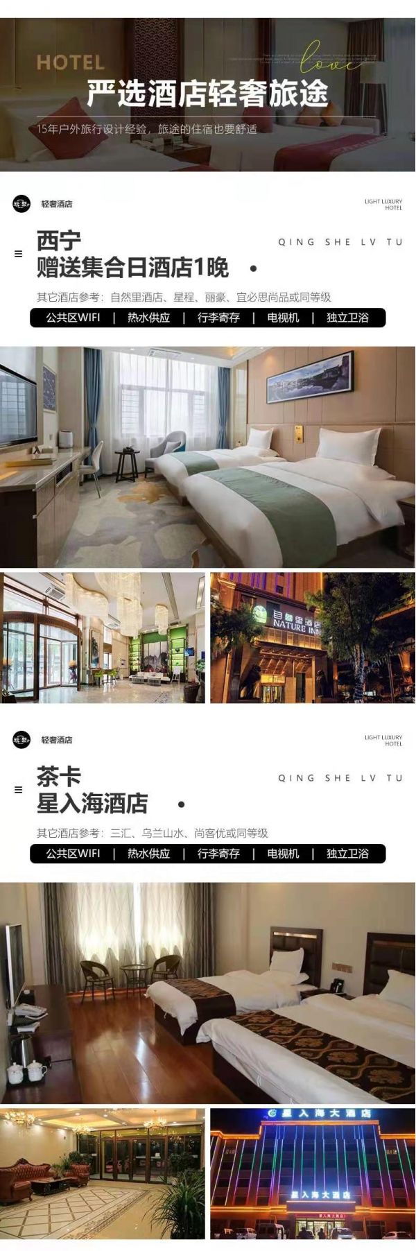 住宿:行程所列6晚住宿。我們會(huì)提供行程內(nèi)展示照片的酒店或其他條件相似酒店,但因沿途條件有限,如酒店設(shè)施達(dá)不到您的期望,請(qǐng)您諒解。西寧:自然里酒店、星程、麗豪、宜必思尚品或其它同級(jí)酒店德令哈:柏菲大酒店、派派、天鴻或其它同級(jí)酒店大柴旦:高原藍(lán)假日酒店、曬北、碧海云天或其它同級(jí)酒店茶卡:星入海、三匯、烏蘭山水、尚客優(yōu)或其它同級(jí)酒店敦煌:賽爾迪酒店、天潤頤和酒店、富麗華國際、禧來敦或其它同級(jí)酒店張掖:柏菲大酒店、派派、天鴻或其它同級(jí)酒店服務(wù):由經(jīng)驗(yàn)豐富的司機(jī)提供向?qū)Х?wù),司機(jī)非導(dǎo)游,不進(jìn)景區(qū),敬請(qǐng)諒解。