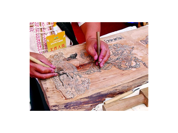 “您在雕刻什么?我能體驗一下嗎?”“把印版放平,刷好顏料,再把紙端正地放上去……”騰沖農(nóng)民畫傳承人賈明安一邊帶游客體驗印甲馬,一邊介紹:“甲馬在古代是用來祈福祭祀的,后來逐漸成為雕版藝術。騰沖有悠久的木刻雕版印刷歷史?!彼钢慌晕吹窨掏甑淖髌氛f,“喏,完成這樣一幅作品要五六天。木頭多選用結構細膩、木質(zhì)良好的梨木,這樣才能雕刻出精細的圖案。”你一言我一語的對話間,游客在賈明安的幫助下既體驗到了印甲馬的過程,又對騰沖甲馬這項非遺項目有了更多了解。