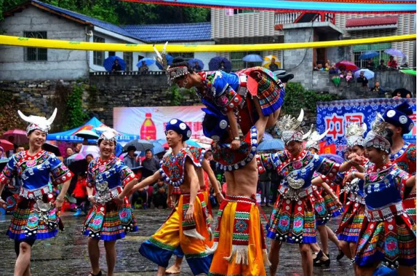 當(dāng)天,苗歌“飛”天,鼓聲“震”地,馬鞍山苗寨跳花坪主會場上人山人海,熱鬧非凡?;顒釉诖笮凸奈璞硌?strong>《弦歌凱鼓頌升平》中拉開序幕。隨后,《喜慶豐收》《長城頌歌》《跳花跳月》等苗族原生態(tài)民俗節(jié)目精彩上演,涵蓋花鼓、苗舞苗歌、苗族銀飾服飾、苗族武術(shù)等,臺下掌聲連連,處處歡聲笑語。最后,苗族同胞與游客一同“跳花跳月”,演繹濃郁民族風(fēng)情,共慶苗族傳統(tǒng)佳節(jié)。