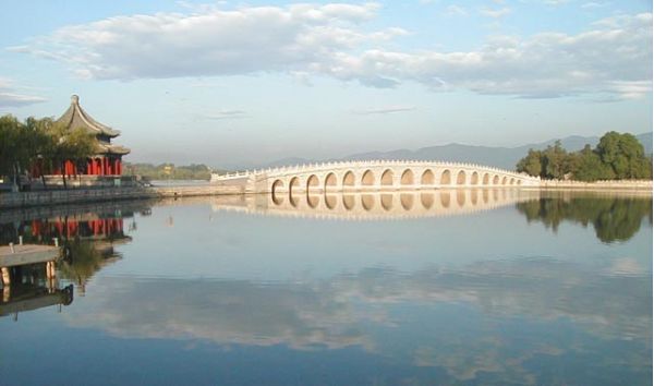 這座巨大的園林依山面水,昆明湖約占全園面積的3/4。但它的水面并不單調(diào),除了湖的四周點綴著各種建筑物外,湖中有一座南湖島,由一座美麗的十七孔橋和岸上相連。在湖的西部,有一西堤,堤上修有六座造形優(yōu)美的橋。頤和園里有許多景點是效法了江南園林的一些優(yōu)點。如諧趣園就是仿無錫寄暢園建造的。西堤是仿杭州西湖的蘇堤。頤和園前山的正中,是一組巨大的建筑群,自山頂?shù)闹腔酆?,往下為佛香閣、德輝殿、排云殿、排云門、云輝玉宇坊,構(gòu)成一條明顯的中軸線。在中軸線的兩邊,又有許多陪襯的建筑物。順山勢而下,又有許多假山隧洞,游人可以上下穿行。 頤和園的后山,其設(shè)計格局則與前山迥然而異。前山的風(fēng)格是宏偉、壯麗,而后山則是以松林幽徑和小橋曲水取勝。