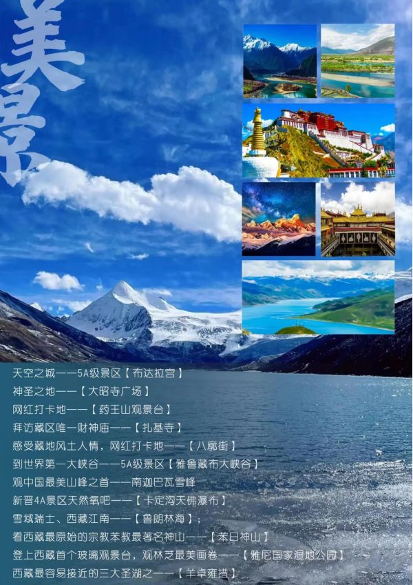 青藏9日游 聊城發(fā)團 純玩 無購物 西寧 拉薩 布達拉宮 藥王山觀景臺 大昭寺廣場 八角街 卡定溝 雅魯藏布大峽谷 尼洋河景觀帶 南迦巴瓦雪峰 ...... 發(fā)團日期 20230616 20230620 價格 4588 報名電話 0635 8681234