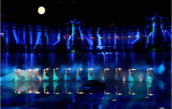 《德夯幻境》以德夯苗寨的天然山水為舞臺,以苗家婚戀、愛情、出征、奮斗、凱旋為線索展開,集苗歌、苗舞、詩情獨白于一體,打造沉浸式5D苗境喜宴劇場。整場演出嘗試了室內(nèi)室外相結(jié)合的模式。室內(nèi)的八個小劇場圍著中心舞臺,演出的上半部分在每個小劇場進行,主要通過話劇表現(xiàn)翠翠的婚姻故事,追憶湘西往事,引出宴席的由來。室外水舞臺正對著德夯大峽谷的高聳奇峰,以著名的德夯大峽谷、德夯苗寨為背景,自然的環(huán)境與光影、音樂、戲劇、公共藝術(shù)、體感交互和多終端數(shù)控技術(shù)疊加起來,營造出一個似劇非劇、似演非演、似宴非宴、似寨非寨的沉浸式體驗空間。