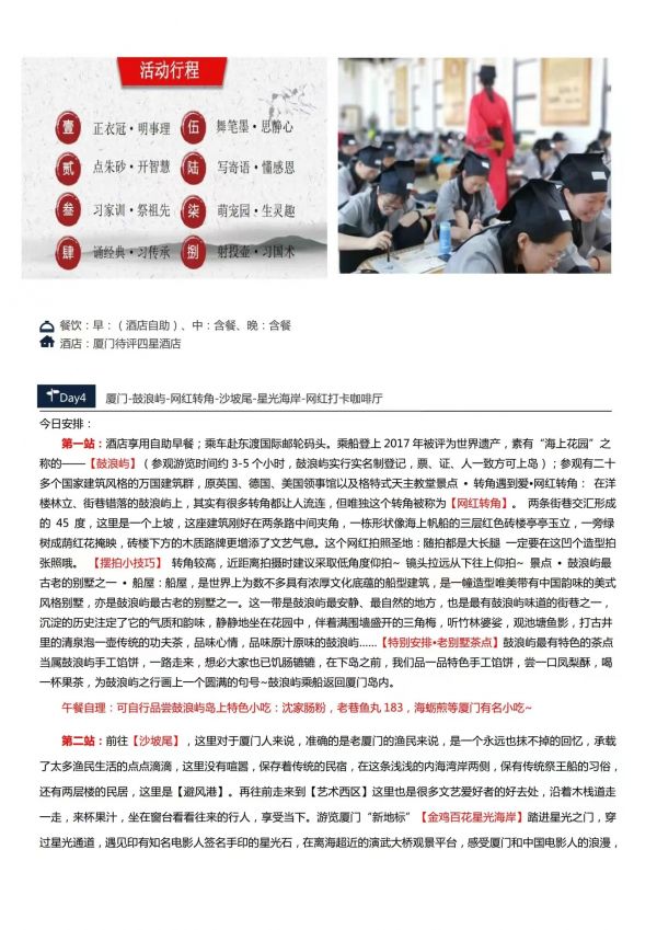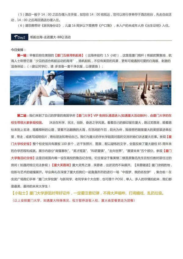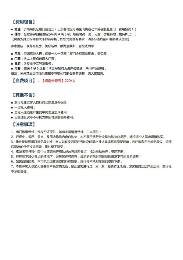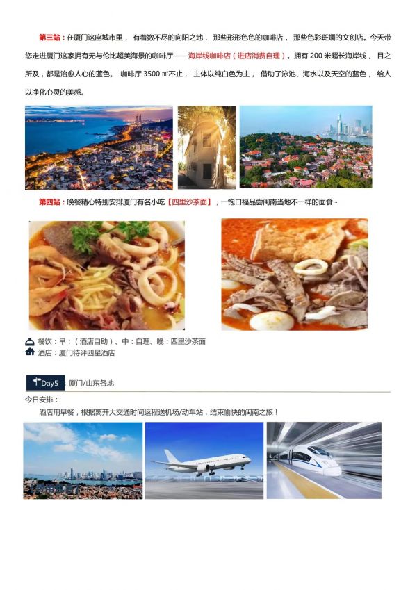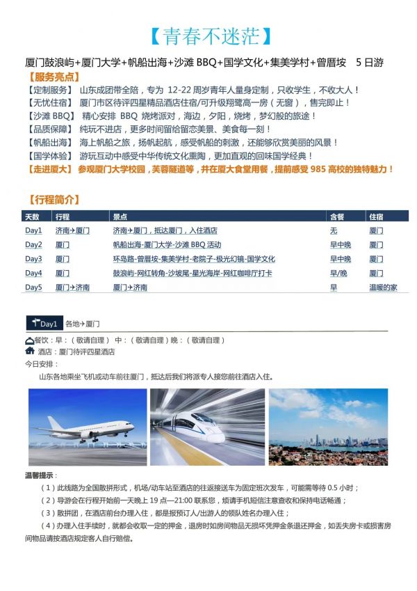 廈門雙飛5日游 聊城發(fā)團(tuán) 純玩 無購物 廈門鼓浪嶼 廈門大學(xué) 帆船出海 沙灘BBQ 國學(xué)文化 集美學(xué)村 曾厝垵 ...... 發(fā)團(tuán)日期 20230616-20230620 20230620-20230624 價(jià)格 4090 4290 報(bào)名電話 0635 8681234