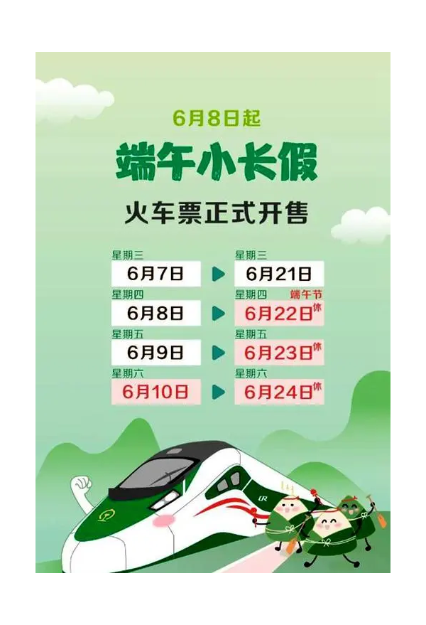 今年端午節(jié)從6月22日至24日放假調(diào)休,共3天。按照目前全國(guó)鐵路車票預(yù)售期15天的規(guī)定,6月8日起,旅客可以通過(guò)鐵路12306網(wǎng)站、鐵路12306APP購(gòu)買6月22日的火車票,6月10日起,可購(gòu)買6月24日的火車票。