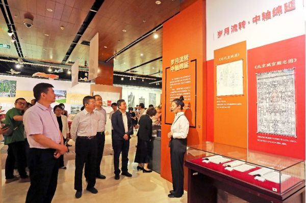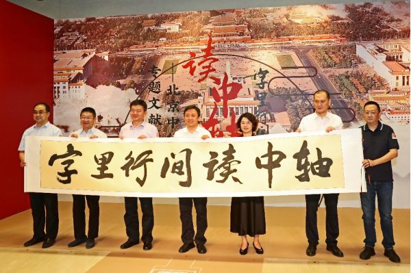 活動(dòng)開幕儀式現(xiàn)場(chǎng),北京市文物局副局長(zhǎng)褚建好,北京市文化和旅游局副局長(zhǎng)王洪濤,北京市東城區(qū)副區(qū)長(zhǎng)唐立,展覽主辦單位以及北京京企中軸線保護(hù)公益基金會(huì)的嘉賓共同展開寫有“字里行間讀中軸”的卷軸,一場(chǎng)講述壯觀中軸、人文中軸、多彩中軸的展覽正式拉開序幕。