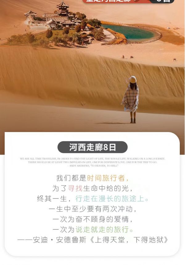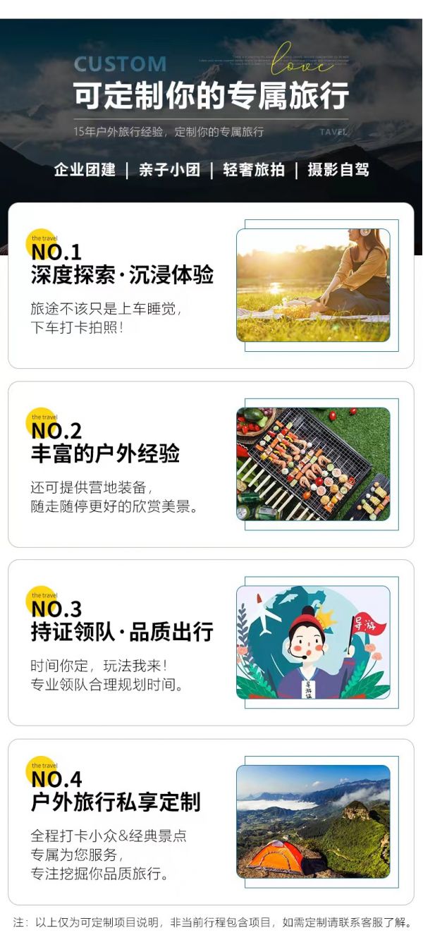 私人訂制:我們業(yè)務范圍囊括了全國各大城市,川西、西北、新疆、西藏,在路上永遠有我們的身影。我們將為每一個有定制需求的你策劃出獨屬于自己的完美旅行。