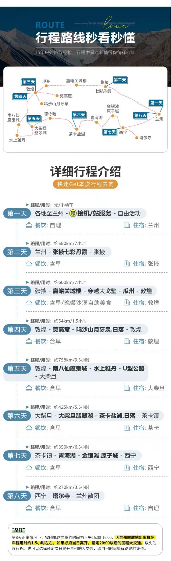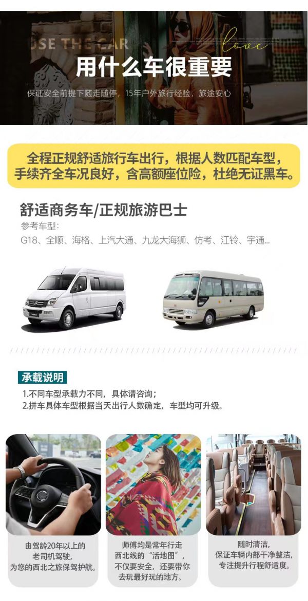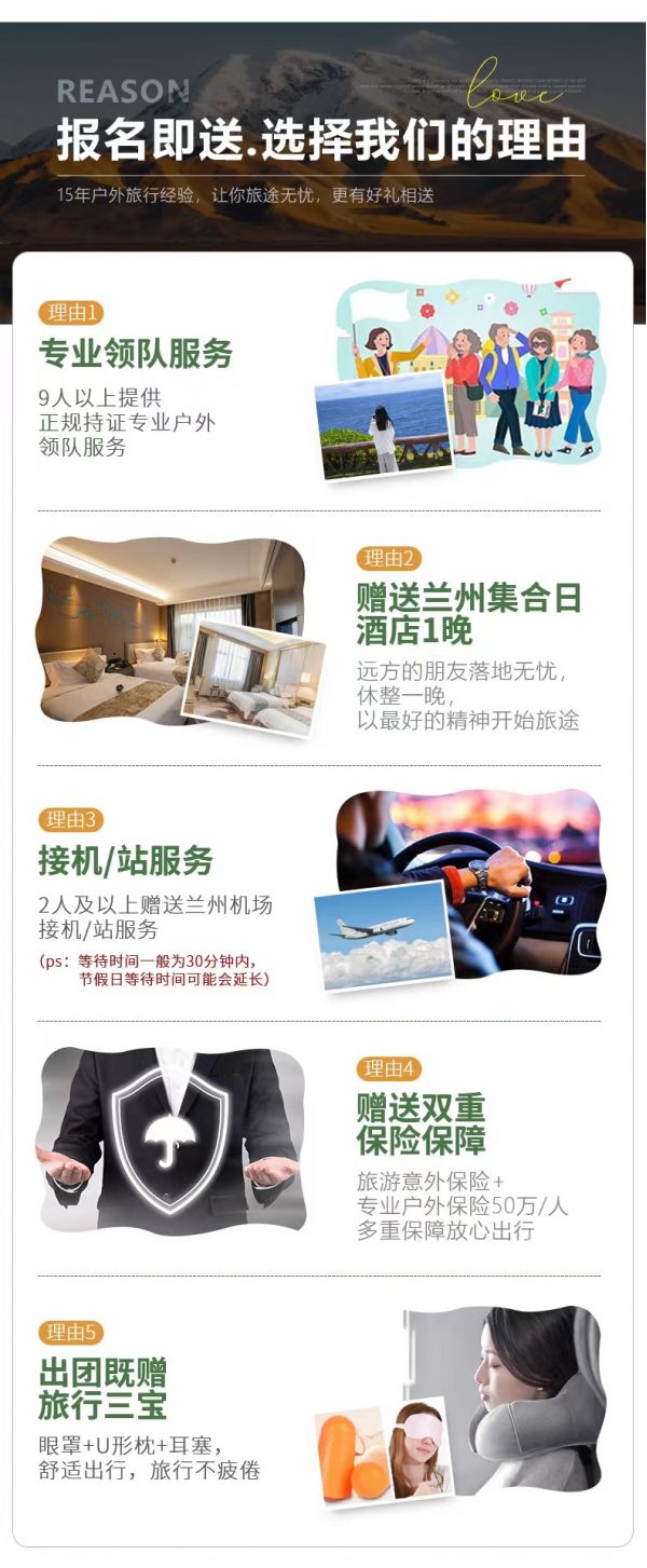 (5)贈送2人及以上蘭州市區(qū)接火車服務;4人以上接機服務,23點后由于運管規(guī)定不能接機/接站,敬請諒解;服務:9人及以上,提供持證正規(guī)導游服務;8人及以下,由經(jīng)驗豐富的司機帶隊,無單獨導游服務,請諒解。保險:贈送高額旅游意外保險,旅游意外保險最高賠付50萬元/人,贈送旅行社責任險,贈送車輛保險;因道路交通事故造成的客人意外傷害,按《道路交通事故處理方法》由保險公司賠償,我方不承擔另外的賠償責任;如有需要,游客可自行購買其他保險。