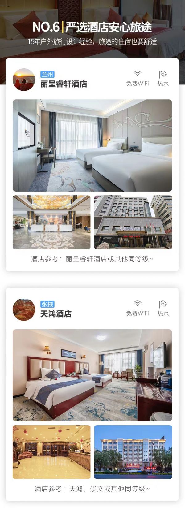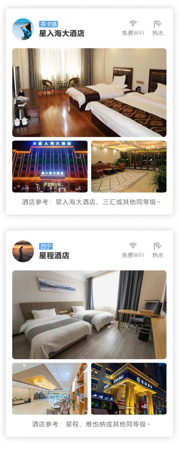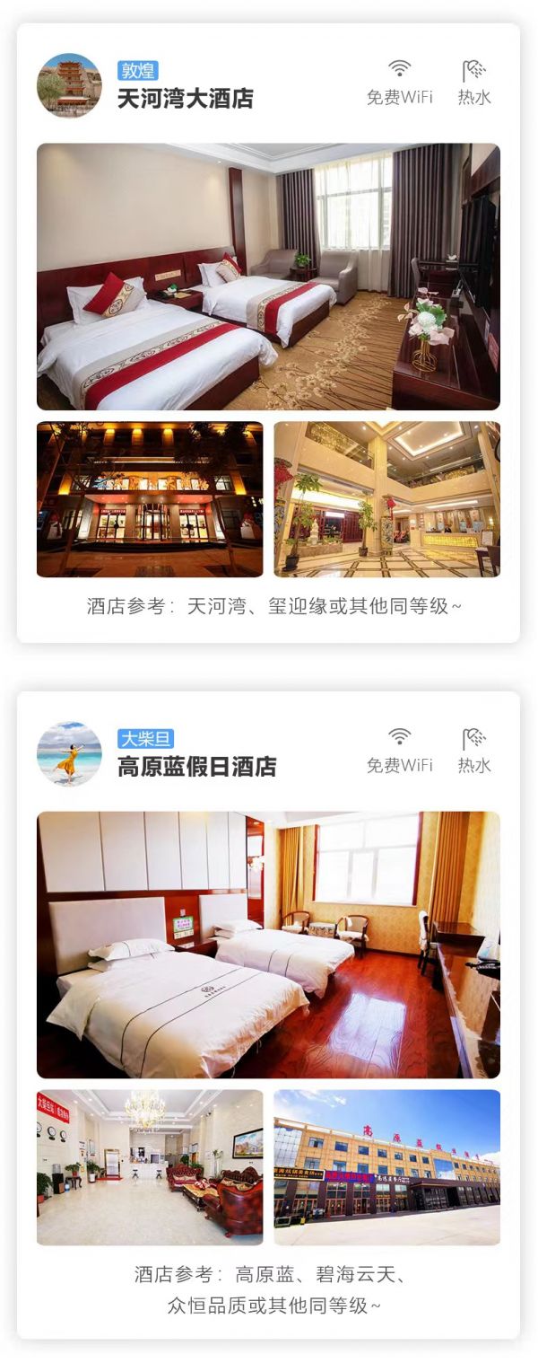 全程正規(guī)舒適旅游巴士,保證一人一正座位,車型大小根據(jù)實際人數(shù)安排,且由駕駛經(jīng)驗豐富的司機為您的出行保駕護航(報價包含車費、油費、停車費、維修費及司機勞務費)。住宿:行程所列7晚住宿。我們會提供行程內(nèi)展示照片的酒店或其他條件相似酒店,但因沿途條件有限,如酒店設施達不到您的期望,請您諒解。參考酒店如下: