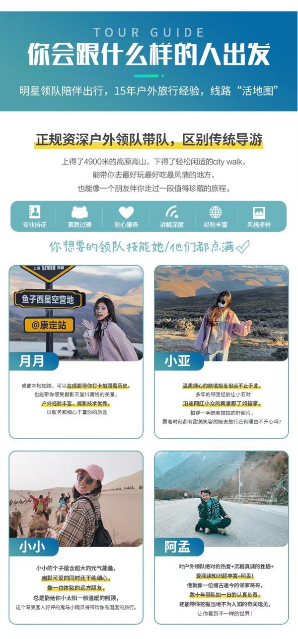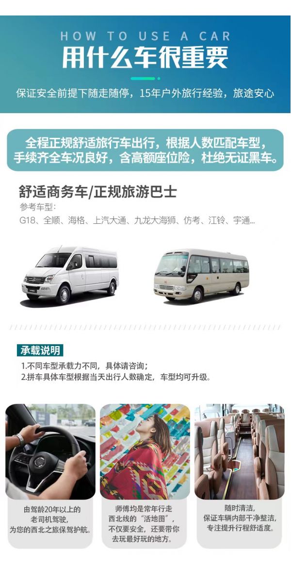 服務(wù):8人以上提供正規(guī)持證專業(yè)戶外領(lǐng)隊服務(wù);8人及以下由經(jīng)驗豐富的司機提供向?qū)Х?wù)。