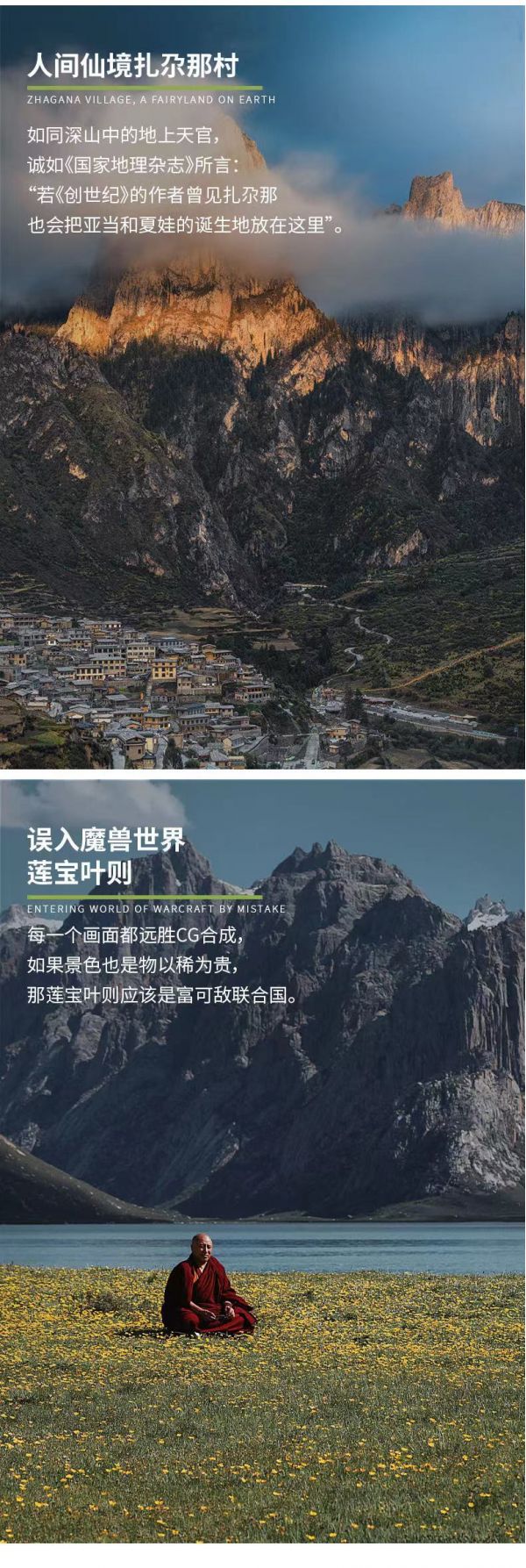 早起我們從迭部出發(fā)到扎尕那,當(dāng)?shù)厝顺Uf“天堂很遠(yuǎn),扎尕那很近”,連美國《國家地理雜志》約瑟夫·洛克也說“我平生未見如此綺麗的景色,若《創(chuàng)世紀(jì)》的作者曾見迭部(扎尕那)也會把亞當(dāng)和夏娃的誕生地放在這里”。位于甘南藏族自治州迭部縣的【扎尕那】,是一圈俏麗的崖壁包裹中的一個藏族小村寨,風(fēng)景秀麗奇幻,是整個甘南藏區(qū)風(fēng)光最為優(yōu)美又最為原始的地方之一。村中古老的木制藏房沿山而建,藏民們安靜淳樸地勞作在山坡河水之間,構(gòu)成美妙的田園風(fēng)光。無論觀光、攝影,還是參觀淳樸藏族人民的傳統(tǒng)生活,這里都是不可錯過的美妙之地。每年7月初左右,暖暖的陽光播撒在扎尕那,田地里的油菜花千朵萬朵壓枝著盛開,將周圍的石山、木屋擁抱其中,彩蝶農(nóng)人流連其間,繪出一副油畫般的絕美田園景象。2017年10月,大熱綜藝《爸爸去哪兒5》攝制組來到扎尕那拍攝,明星爸爸們帶著萌娃來到了這里,再一次將這個古樸美麗的小村莊展現(xiàn)在世人面前,我們此次便沿著熒屏里記錄過的風(fēng)景前去收獲這片人間凈土。