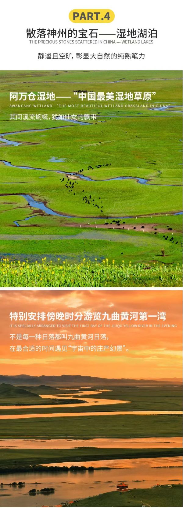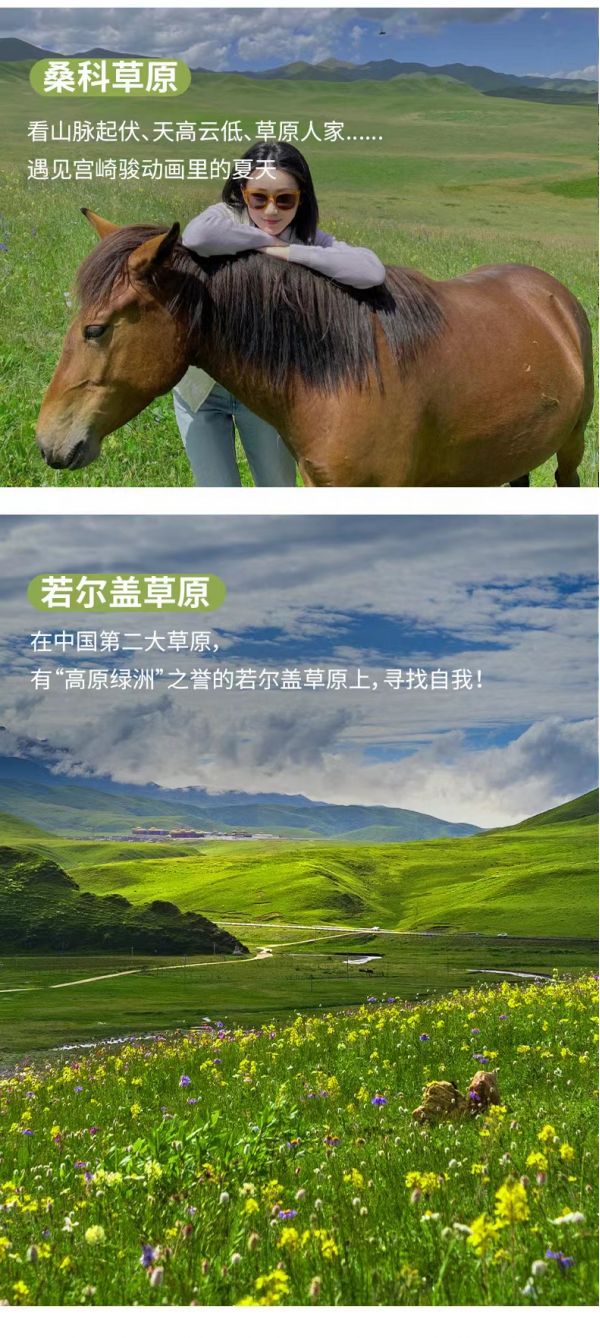繼續(xù)行程,我們將來到“中國最美濕地草原”——【阿萬倉濕地】,這片濕地臥在甘肅省南部黃河的臂彎里,黃河自西向東從青海久治進(jìn)入瑪曲木西合,因水瀉不暢而形成很多汊河和沼澤,使這片廣袤的草原水草豐茂、牛羊肥壯。這里地處偏遠(yuǎn),但也正因他的閉塞,才造就了這片世界遺落的草原的幽美浩瀚,彎曲的河流,登上觀景臺,俯瞰一望無垠的阿萬倉濕地,散落的牦牛、潔白的羊群在茵茵草場上星羅棋布,沼澤在陽光下泛著粼粼光波,如同一幀靜止的電影畫面,閑逸至極。從阿萬倉濕地驅(qū)往阿壩的途中我們會途經(jīng)??撇菰?,解鎖車觀桑科草原的新視角、新體驗。
