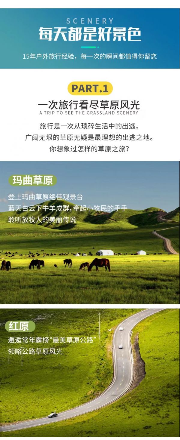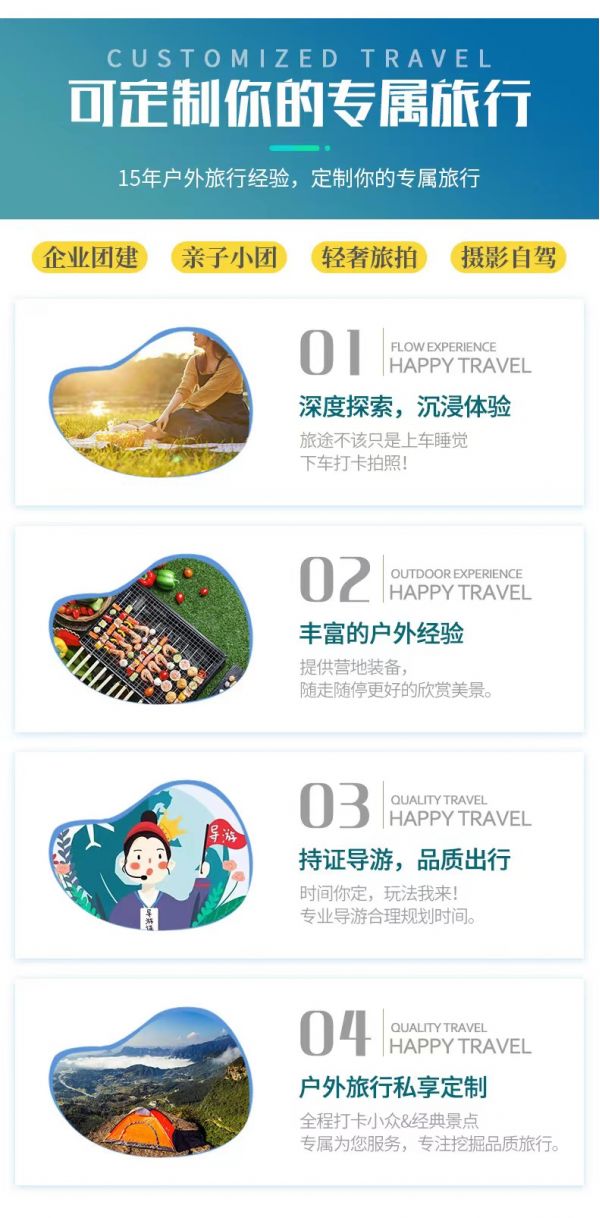 私人訂制:我們業(yè)務(wù)范圍囊括了全國各大城市,川西、西北、西藏、新疆,在路上永遠(yuǎn)有我們的身影。我們將為每一個有定制需求的你策劃出獨屬于自己的完美旅行。