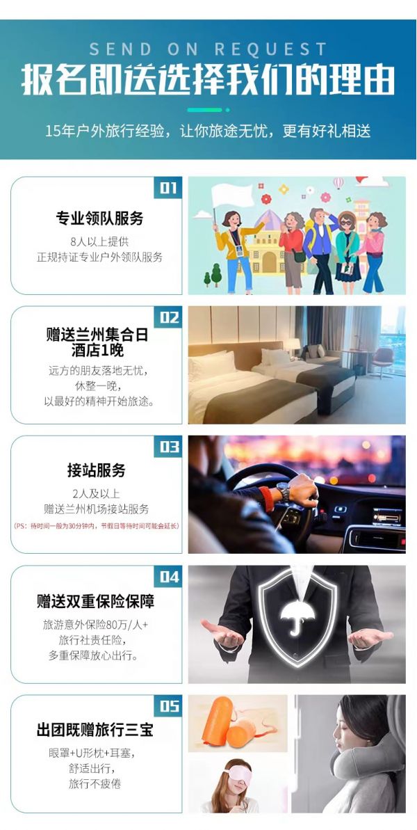 接站服務(wù):2人及以上免費提供蘭州市區(qū)拼車接火車服務(wù),接火車的工作人員會在您出發(fā)日期前一天21:30之前向您推送消息并與您聯(lián)系,如果超過時間沒有接到任何通知,請及時與領(lǐng)隊或報名處聯(lián)系。(節(jié)假日用車人數(shù)較多情況下客人等待時間可能會延長;我方會安排臨近航班拼車接站,如遇其他客人航班火車延誤晚點情況,等待時間可能會延長,敬請諒解)