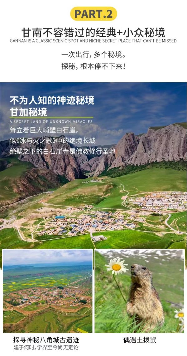 即日起甘加秘境門票內(nèi)暫不包含白石崖寺、溶洞,如需要游覽寺院內(nèi)或進(jìn)溶洞需要另行購票。購買(車票+門票)套票的游客按景交車固定路線游覽,可前往八角古城站、白石崖寺前站,白石秘境觀景臺、路過星空草原到達(dá)游客服務(wù)中心,作海寺可自行前往,給廣大游客帶來不便,還望諒解。)