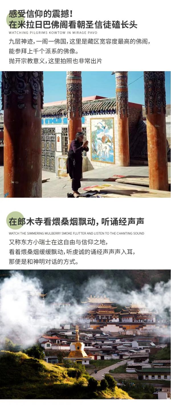 而后前往米拉日巴佛閣。甘南擁有最密集、最豐富的藏傳佛教寺廟,【米拉日巴佛閣】便是其中最著名的代表作,被稱為“九層神跡”。米拉日巴佛閣是藏傳佛教噶舉派(白教)在安多藏區(qū)的代表寺院,閣內(nèi)主要供奉藏傳佛教史上最富傳奇色彩、婦孺皆知的米拉日巴尊者,他同時也是噶舉派創(chuàng)教者之一。米拉日巴佛閣樓高共九層,有以金剛為主的四密乘的眾多佛像、菩薩、護(hù)法神等各類佛像1720尊,還有規(guī)模巨大的反映藏傳佛教內(nèi)容的各類壁畫,繪畫技法高超,具有很高的藝術(shù)價值。在這里聽聽米拉日巴尊者的傳奇故事,了解藏傳佛教各個教派的歷史,在僧人呢喃佛音中感受那份信仰的虔誠。