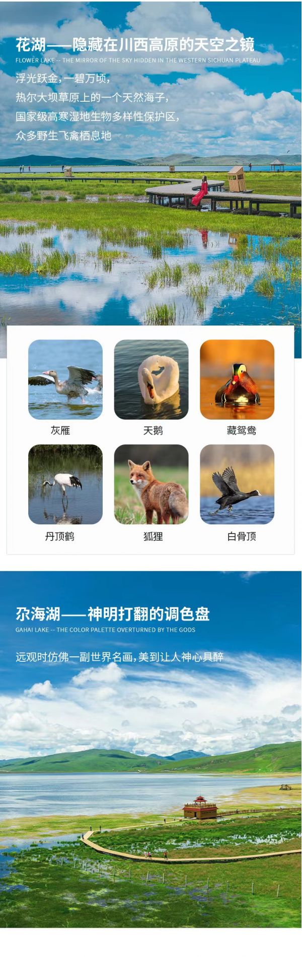 然后我們前往草原湖泊【花湖】。在僅次于呼倫貝爾草原的熱爾大壩草原之上,有一個絕美的天然海子---花湖?;ê竦貙儆趪壹壐吆疂竦厣锒鄻有员Wo(hù)區(qū),是眾多野生飛禽的主要棲息地,如灰雁、白骨頂、天鵝、黑頸鶴、丹頂鶴、藏鴛鴦、狐貍等。花湖的夏天和秋天別有一番風(fēng)味。夏天,號稱“天空之境”的花湖,周邊開滿野花,美輪美奐。秋天,廣闊的草原變成一片金黃,藍(lán)色的花湖被包圍其中,仿佛金色地毯上的一顆藍(lán)寶石。湖邊建有木質(zhì)棧道,一直延伸到水中,可以沿著棧道走到濕地深處,沿途都可以找到拍大片的好角度。