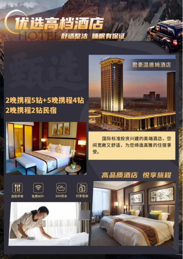 烏魯木齊五鉆參考酒店:尊茂鴻福大酒店/南航明珠國際酒店/君豪溫德姆大酒店/銀星酒店或同級別酒店;
