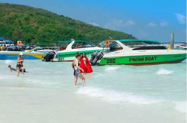 清澈,礁石、小魚、海蜇等 等盡收眼底;水上娛樂項(xiàng)目繁多,游客可自費(fèi)選擇新鮮刺激的海上降落傘項(xiàng)目、體驗(yàn)潛水等項(xiàng)目。金沙島主要海灘有達(dá)元海灘、通朗海灘、桑灣海灘、天海灘、薩美海灘以及象牙灣。其中中國(guó)隨團(tuán)游客主要前往達(dá)元海灘,你既可享受在清澈湛藍(lán)的水游泳,也可以享受香蕉船、摩托艇等各種水上活動(dòng);天海灘因?yàn)槠鋵庫(kù)o休閑深得泰國(guó)當(dāng)?shù)鼐用竦南矏郏糠曛苣┚蜁?huì)有很多泰國(guó)家庭帶著家眷到這里;薩美海灘是另外一個(gè)比較長(zhǎng)的 海灘,這里神的歐洲游客的喜歡,在這里經(jīng)??梢钥吹浇鸢l(fā)女郎穿著性感的比基尼泳裝、涂抹一身防曬霜或是橄欖油,在沙灘上鋪一條大浴巾,毫無(wú)顧忌地享受日光??;而象牙灣由于人跡罕至,所以成了好多情侶戀人的最佳選擇。金沙島因?yàn)槠鋬?yōu)美的島嶼風(fēng)光,海灘風(fēng)光已經(jīng)成為泰國(guó)人以及外國(guó)游客來(lái)到芭提雅旅游的一個(gè)必經(jīng)之地。