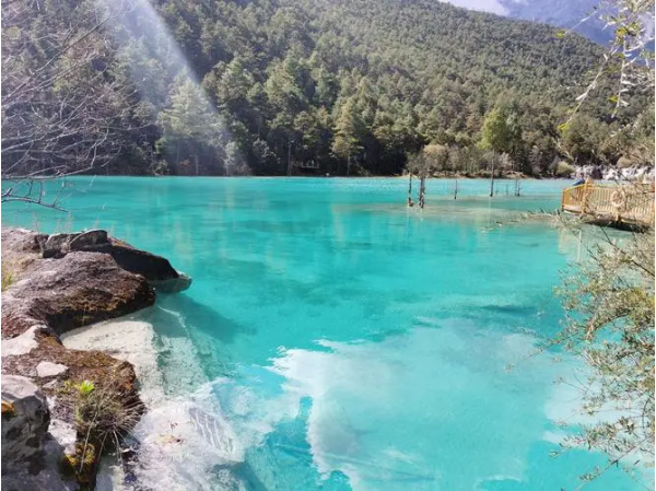 從馬路的兩旁延綿而過,躍入眼簾的是藍色的湖水,這是雪山的冰雪融水。由于水中有著銅離子,因此呈現(xiàn)藍色,不可飲用。高遠的山峰與叢林,仿佛森嚴的守衛(wèi),保護著這孤獨的澄澈的藍月谷湖水。