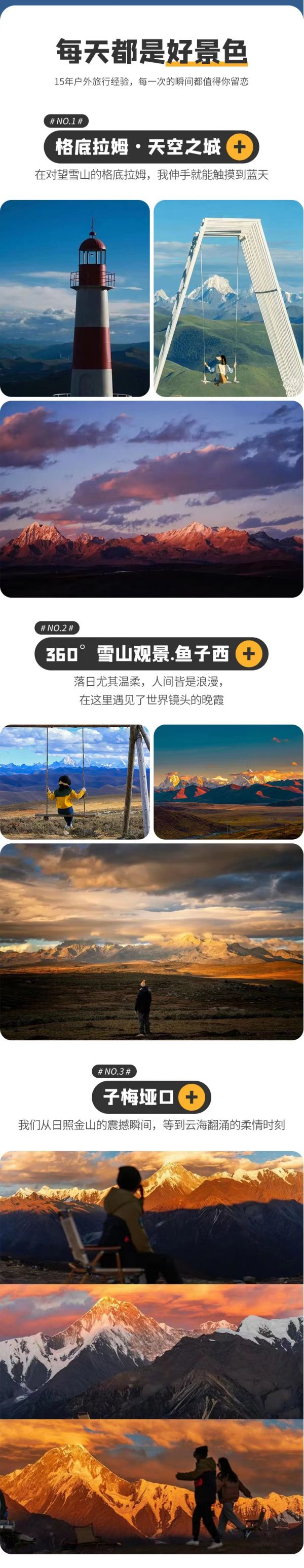 2、若格底拉姆·天空之城、魚子西因下雪或者管制需要中轉(zhuǎn)車進入,費用自理。若領(lǐng)隊陪同上山,中轉(zhuǎn)車費客人負責AA。如果魚子西森林防火期間則取消,在格底拉姆看日落。