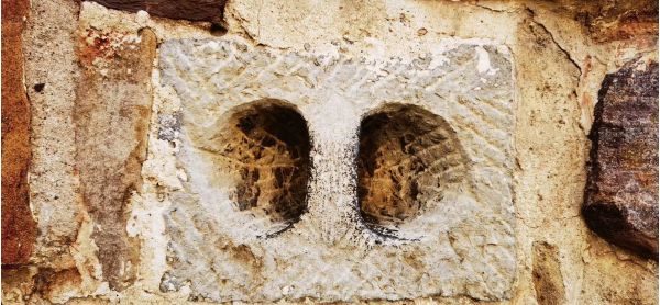 樓梯內(nèi)設(shè)為木制,一律九階。富庶人家的樓梯兩側(cè)扶手雕有蝙蝠石榴等裝飾,在大門外墻上,雕有雙桃狀帶鼻栓馬凹槽,墻外的栓馬槽是客用的,數(shù)量多少與主人的地位或財富相匹配。蝙蝠、石榴、桃子,寓福壽雙全多子多福之意。