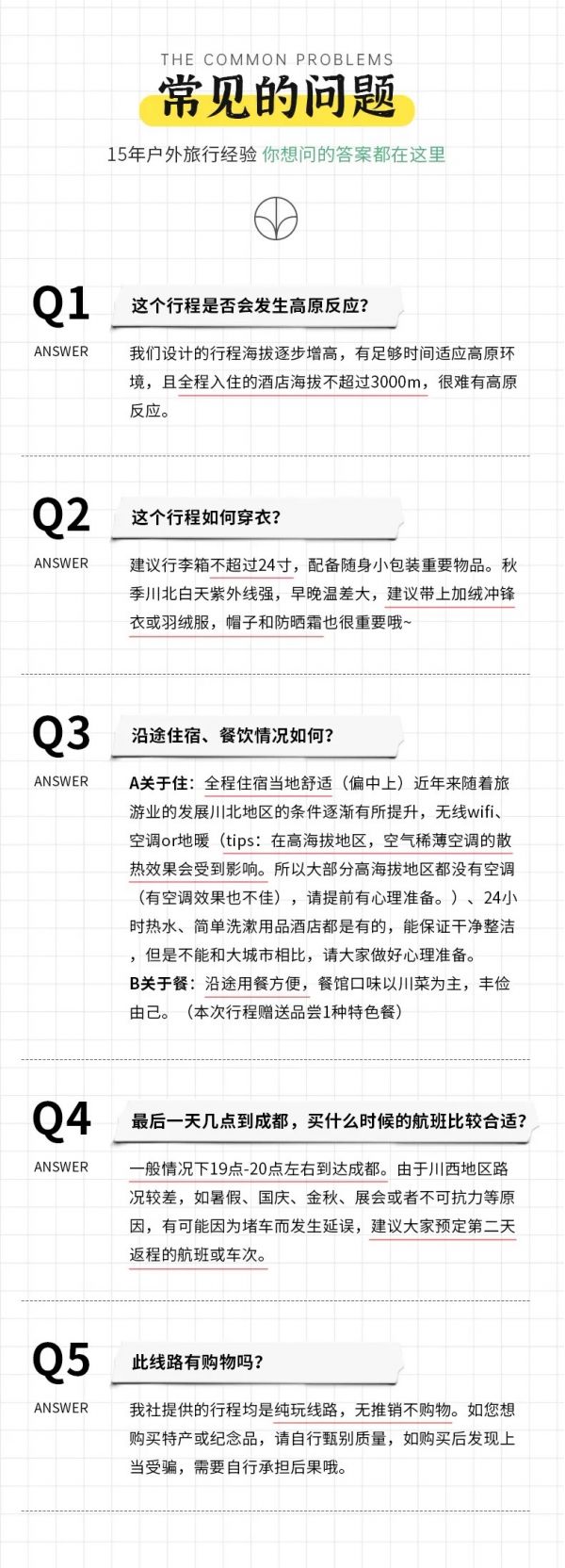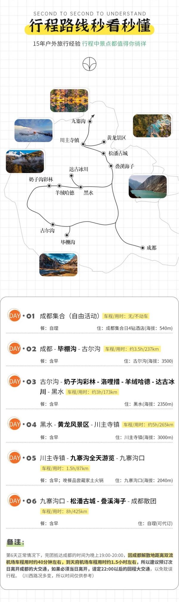 (1)以上行程時(shí)間安排可能會(huì)因天氣、路況等原因做相應(yīng)調(diào)整,正常情況下完團(tuán)回到成都時(shí)間為晚上19:00至20:00左右,如果必須當(dāng)日離開(kāi),請(qǐng)定22:00以后的回程大交通,以免耽誤行程,敬請(qǐng)諒解;