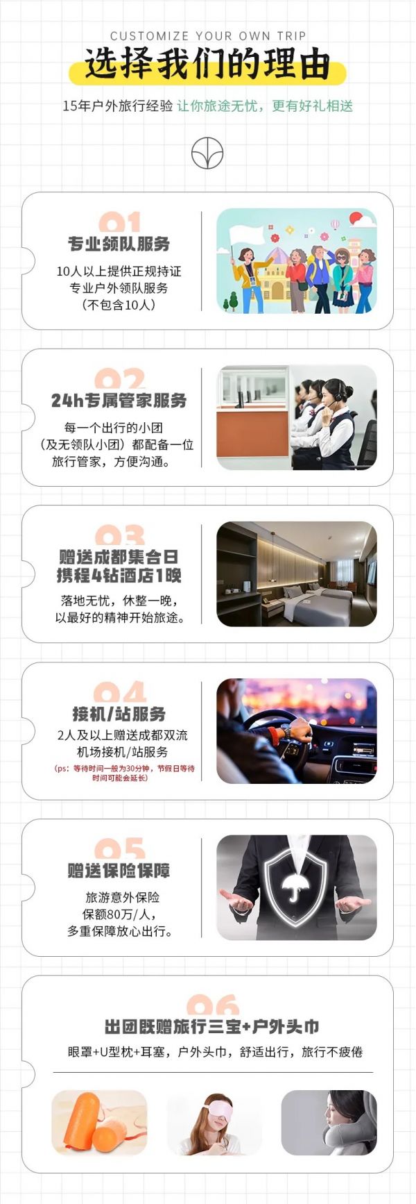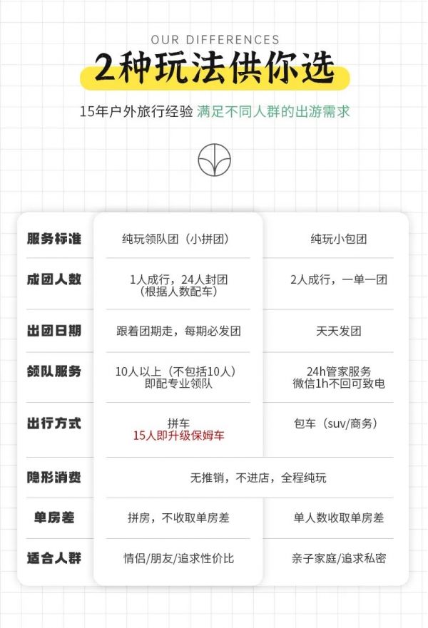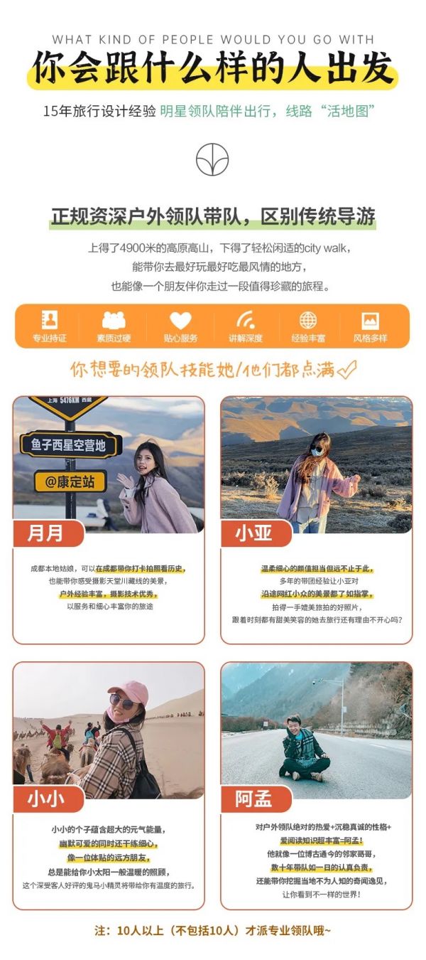 私人訂制:我們業(yè)務(wù)范圍囊括了全國(guó)各大城市,川西、西北、新疆,在路上永遠(yuǎn)有我們的身影。我們將為每一個(gè)有定制需求的你策劃出獨(dú)屬于自己的完美旅行。
