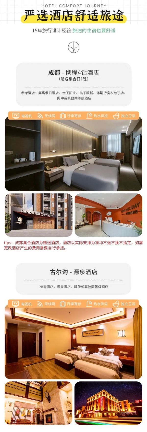 住宿:含全程5晚舒適酒店。(tips:成都集合酒店為贈(zèng)送酒店,酒店以實(shí)際安排為準(zhǔn)均不換不退不指定,如要更改酒店產(chǎn)生的費(fèi)用需要自行承擔(dān)。)