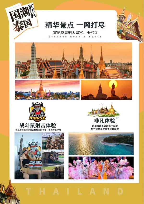 今日安排:早餐后前往,【四面佛】泰國(guó)是佛教國(guó)家,全國(guó)大大小小的佛寺數(shù)不勝數(shù)。四面佛,人稱(chēng)“有求必應(yīng)”佛,該佛有四尊佛面,分別代表愛(ài)情、事業(yè)、健康與財(cái)運(yùn),掌管人間的一切事務(wù),是泰國(guó)香火最旺的佛像之一。正面求生意興隆,左面求姻緣美滿,右面求平安健康,后面求招財(cái)進(jìn)寶。對(duì)信奉佛教的人來(lái)說(shuō),到曼谷來(lái)不拜四面佛,就如入廟不拜神一樣,是一件不可想象的事。據(jù)說(shuō)四面佛的靈驗(yàn)超乎尋常,因此,有些游客為了在四面佛前許誓還愿而多次往返泰國(guó),更有許多港臺(tái)影視明星,年年都來(lái)泰國(guó)膜拜四面佛,可見(jiàn)四面佛的魅力。前往【KINGPOWER國(guó)際免稅店】 此為泰國(guó)最大的免稅商店,各種國(guó)際頂尖名牌商品,歐萊雅、雅斯蘭黛、香奈兒、蘭蔻、迪奧、施華洛世奇等等在這里都有專(zhuān)柜展覽,并不定期提供特別折扣,客戶在曼谷市區(qū)購(gòu)買(mǎi)即可在機(jī)場(chǎng)直接取貨,不想買(mǎi)名牌的可以一飽眼福,還可以購(gòu)買(mǎi)土特產(chǎn)贈(zèng)送親朋好友,更是不可錯(cuò)過(guò)的好機(jī)會(huì)。【喬德夜市JoddFairs】(約120分鐘),泰國(guó)各地夜市繁多,來(lái)泰國(guó)怎能錯(cuò)過(guò)當(dāng)?shù)氐囊故?,泰?guó)的夜市就像一個(gè)寶藏,在此不僅可以尋覓到當(dāng)?shù)靥厣朗?,穿梭于人群與煙火,還能充分的感受到泰式生活的慢與漫