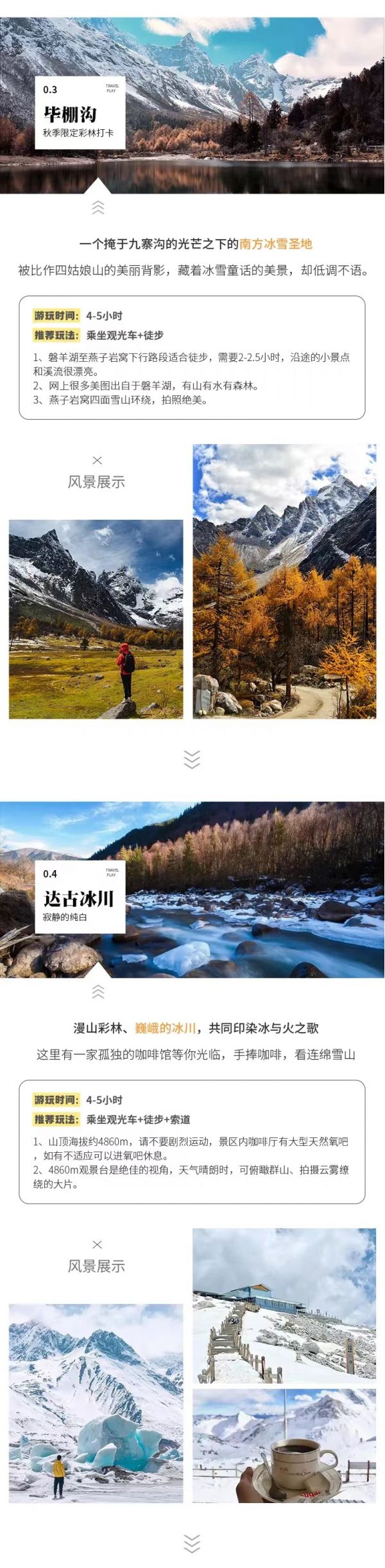 隨后游覽【紅軍湖】、【紅軍橋】、【神牛湖】,欣賞沿途的美景。后到達(dá)索道下站,也就是觀光車終點(diǎn)站,從這里開始就是達(dá)古冰川的精華景點(diǎn),10-11月紅葉彩林漫山遍野,層林盡染,猶如一幅彩色油畫。我們可以在索道下站坐索道直接上到山頂?shù)谋ǜ沟?,看連綿雪山冰川,觀賞【一號(hào)冰川】,感受一覽眾山小,俯視一切的雄壯氣概。還可以在世界上海拔最高的咖啡館,同時(shí)也被稱為【世界上最孤獨(dú)的咖啡館】,喝上一杯咖啡,飽覽美景。看過冰山下的秋景前往黑水縣入住。