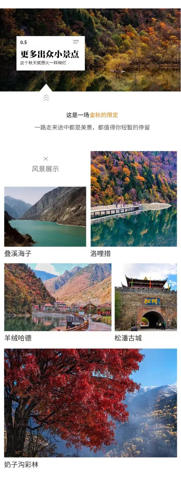 住宿:黑水酒店標(biāo)間說明”早餐后經(jīng)米亞羅、鷓鴣山隧道,隨后來(lái)到奶子溝,秋天的【奶子溝】是彩林的世界,在雄奇的冰川下、美麗的雪山上、獨(dú)特的藏寨邊、蜿蜒河流旁均有成片的彩林分布,是亞洲最大的天然彩林,享有“八十里畫廊”的美譽(yù)。游覽拍攝之后車?yán)^續(xù)前行,沿途會(huì)經(jīng)過一個(gè)叫【洛哩措】的地方,這里像是一塊地球送給我們的綠寶石,陽(yáng)光和煦、波光粼粼,連掠過的風(fēng),都是自由的。隨后來(lái)到【羊茸哈德藏寨】,當(dāng)?shù)厝私小岸透隆?,意思是?strong>神仙居住的地方”,清一水的藏式民居坐落于彩林間,彩色的窗沿點(diǎn)綴著整個(gè)建筑,色彩素雅又歡快。藏寨碧水潺潺、林蔭繁茂、彩林環(huán)繞、色調(diào)分明、鱗次櫛比,這里的藏人服飾獨(dú)特,淳樸善良,隨處可見神秘的宗教符號(hào),五彩的藏家建筑與七彩經(jīng)幡交相輝映,有著濃郁的嘉絨藏族風(fēng)情。